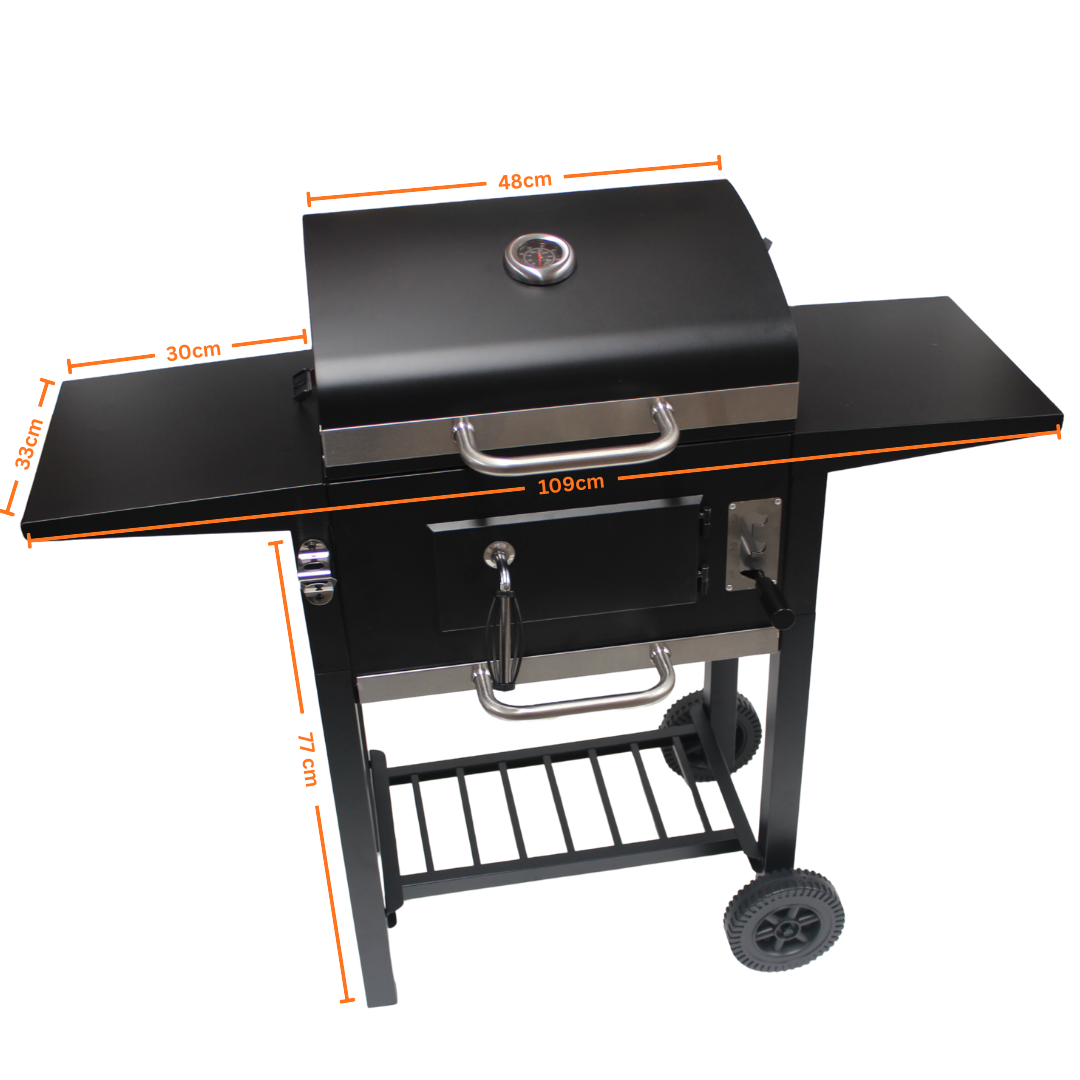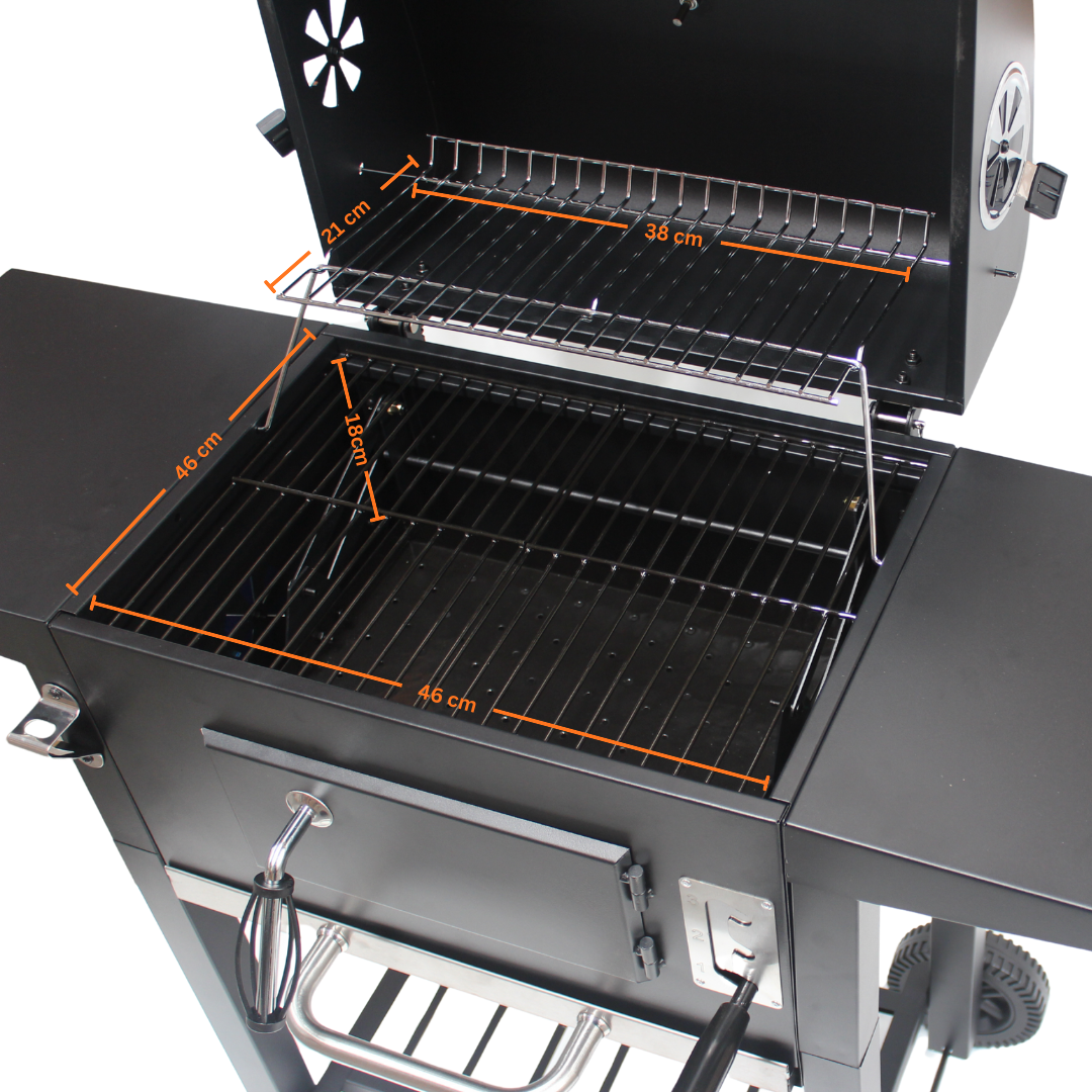 Adjustable Charcoal Pan: Easily control the heat intensity by raising or lowering the charcoal pan, providing versatility for searing, grilling, and slow cooking.